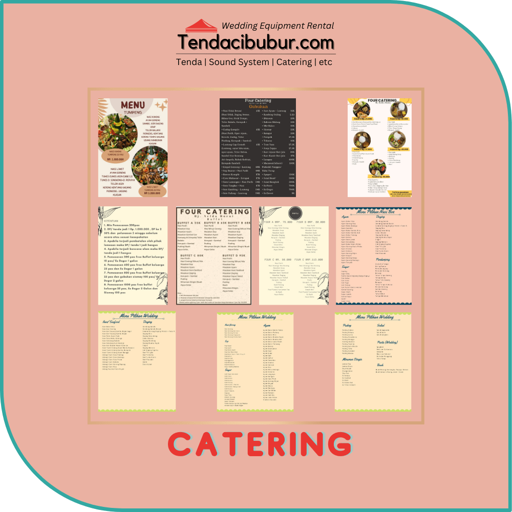 Berikut daftar harga tenda dan alat pesta seperti Paket Catering, Tenda Plafon, Tenda Dekorasi, Tenda Semi Dekorasi, Tenda Kerucut, Tenda Roder, Sewa AC Standing, Sewa Genset Silent, Kipas Blower/Misty Fan, Sewa Sound System, dan lain-lain